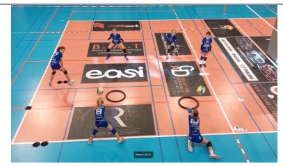 Au lieu de se déplacer en slalom, le joueur met un pied de chaque côté de 2 plots. Il effectue un saut où les 2 pieds se touchent, puis il revient en écart. Ensuite, il recule entre les 2 plots en essayant d’augmenter l’amplitude de ses pas. Puis il revient autour de 2 autres plots, où il effectue un 2e saut. Il arrive près du ballon et lance la balle vers son partenaire. Celui-ci lui lance les ballons comme précédemment, mais le retour s’effectue maintenant en manchette directe. Ce sont les premiers ballons qui sont frappés à 2 bras.