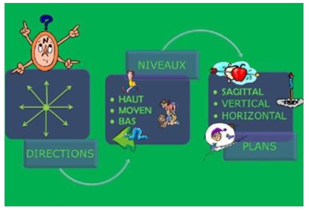 Il existe 3 grands chapitres dans la notion d’espace : jouer avec les directions, avec les niveaux et avec les plans (voir ci-dessous).