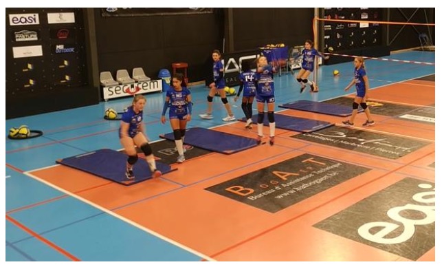 De cette position, dès l’atterrissage, enchaîner avec un demi-tour, prendre la position pied gauche sur le tapis, pied droit derrière et enchaîner avec l’élan d’attaque et la battue droite-gauche.
