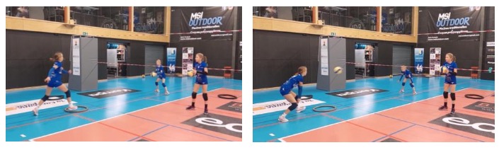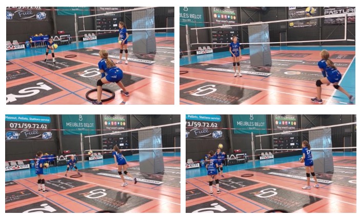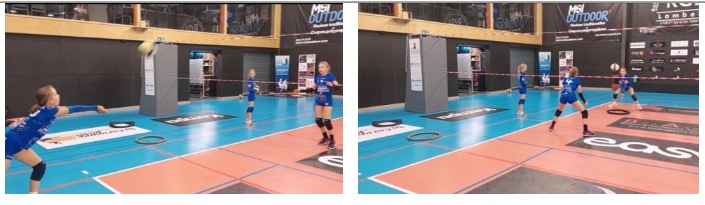 Cet exercice constitue une autre géographie avec une autre disposition des joueurs. Cette disposition peut s’avérer plus simple pour les joueurs que la trilogie 8-9-10. Elle permet aussi de toucher de nombreux ballons en peu de temps. L’idée est donc d’associer, dans un laps de temps très court, une manchette directe avec une trajectoire plate et une manchette après rebond sur une trajectoire haute.