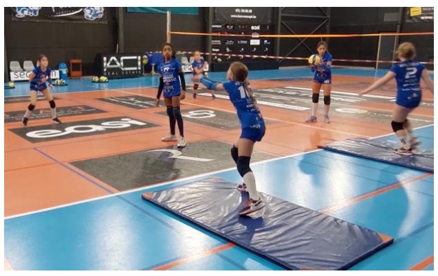 Ce joueur qui attrape la balle recule, effectue une frappe d’attaque du bas vers le haut qui doit être attrapée (ici, sans rebond, mais vous pouvez permettre un rebond).