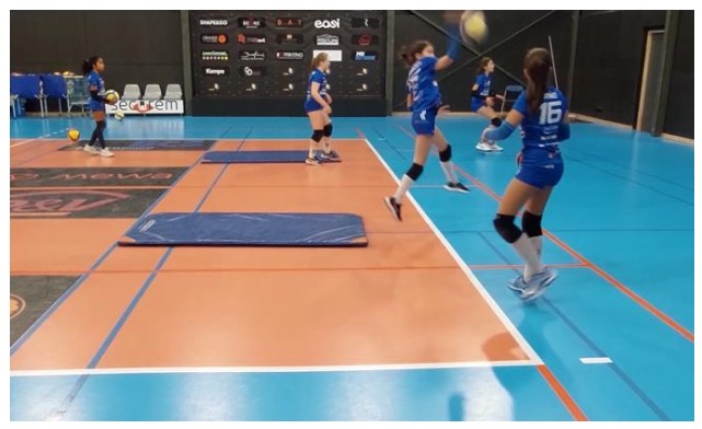 Cet exercice s’effectue sous forme de jeu. Pour marquer un point, il faut enchaîner 2 frappes : d’abord attraper la frappe par le bas qui a touché le mur, puis enchaîner avec une attaque (ici en sautant, mais on peut aussi l’effectuer sans saut).