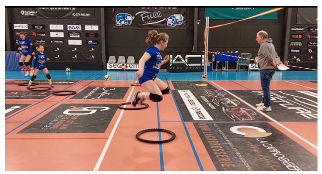 À partir de la position écartée autour du pneu, on va demander aux joueurs de quitter la position et d’y revenir, en faisant se toucher les 2 pieds au-dessus du pneu puis en revenant à la position initiale.