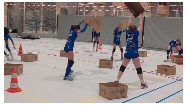 Cette tâche propose un autre verbe d’action qu’on a déjà pu utiliser dans la séance précédente : « soulever » la caisse largement au-dessus de la tête, ce qui implique la réalisation d’un squat complet.