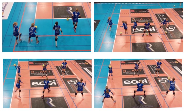 Si vous vous référez à la séance 2, vous pouvez aussi déjà ici utiliser les différentes formes de recul. L’exercice proposé sur la vidéo montre 3 reculs, sans obliger le joueur à reculer de telle ou de telle manière, mais rien ne vous empêche bien évidemment de le faire, ou de limiter le nombre d’actions de recul à effectuer par le volleyeur, en fonction du nombre d’enfants par groupe.