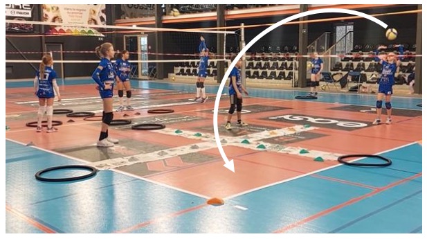 L’idée de cet exercice est de jouer au-dessus de l’élastique avec une intention précise ; dans l’exercice 4, on était dans l’optique de viser une zone ; dans le 5 on est plutôt dans l’optique tactique d’éviter une zone. On va travailler le fait de produire une trajectoire qui arrive à un endroit où le joueur n’est pas.