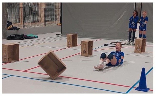 Consigne : contourner une caisse, toucher une 2e caisse et renverser une 3e caisse au moyen de ses pieds (en position de couché dorsal, latéral ou en position assise).