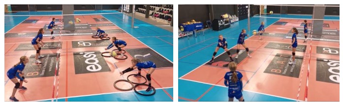 Le recul s’effectue cette fois en un temps, (les 2 pieds atterrissent au même moment – 1 dans chaque pneu pour que le joueur finisse en écart). De cette position, le lanceur lance la balle sous l’élastique du bas, et le joueur qui vient d’effectuer le recul dans les pneus joue la manchette directe.