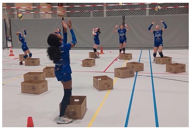 Cette consigne va les inciter à jouer la passe haute le plus haut possible. Ils vont donc utiliser la connexion coudes-poignets pour donner assez de hauteur à la balle et l’applaudir le plus grand nombre de fois possible.