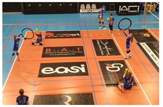 Le joueur qui a réussi la 1e tâche vient s’asseoir à la distance souhaitée (environ 2m) du pneu de vélo et, au départ de la position assise, essaie de faire en sorte que la passe ou le lancer traverse le pneu.