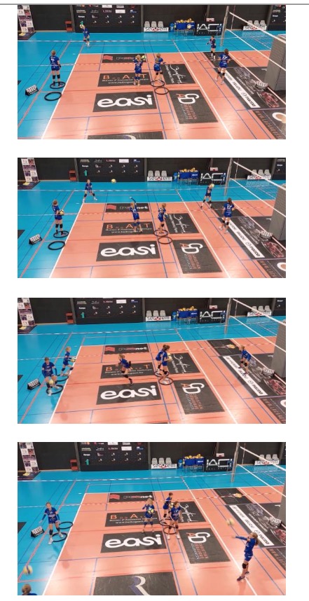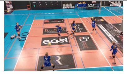 Pour les enfants un peu plus forts, le même joueur doit attraper la balle, ce qui est plus exigeant au niveau de l’orientation du corps pour la 2e manchette.