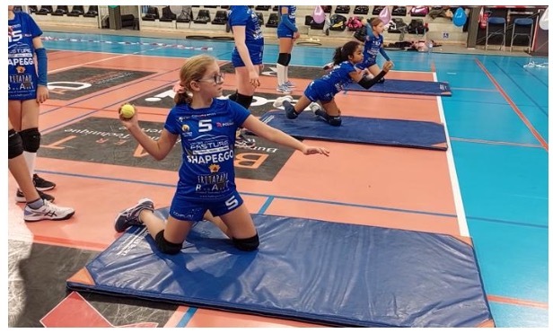 Les cibles sont à toucher au départ d’une position à genoux, mais le genou droit et la hanche droite sont reculés de façon à permettre l’ouverture du corps pour lancer. Ici, on le fait sur un tapis, mais ce n’est pas obligatoire, c’est simplement pour le jeu. L’idée est de reculer de plus en plus la position de départ pour inciter les enfants à armer le bras pour lancer les balles.