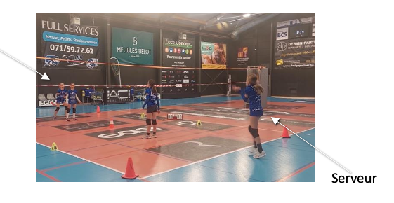 (le futur volleyeur) se rend près d’un des marque-sol placés sur les lignes latérales. Le joueur qui a attrapé la balle la lance vers son partenaire. Ce lancer s’effectue le plus