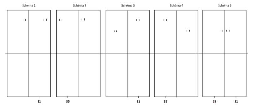 2 schémas correspondant à un positionnement des 2 joueurs sur 2/3 du terrain en privilégiant la disposition par rapport à un service de la ligne (schémas 1 et 2).