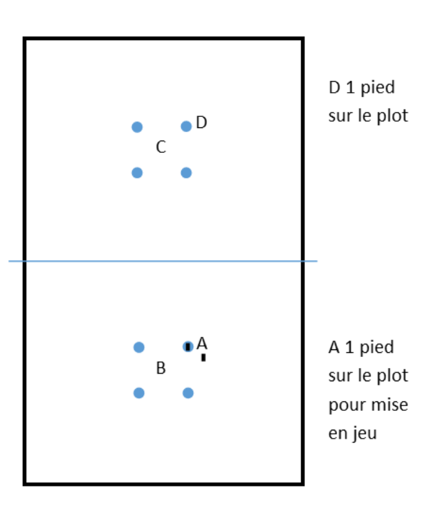 Les joueurs sont par équipes de 2 et les 2 joueurs sont sur le terrain. Un joueur est placé au centre du carré formé par les 4 marque-sol (voir schéma). Son partenaire a