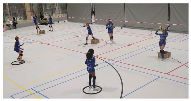 Le lancer s’effectue toujours suite à une extension, mais le pied placé derrière la caisse se retrouve devant la caisse. Cela sensibilise le joueur au fait que la passe haute doit s’effectuer un pied devant l’autre et pas les 2 appuis sur la même ligne.