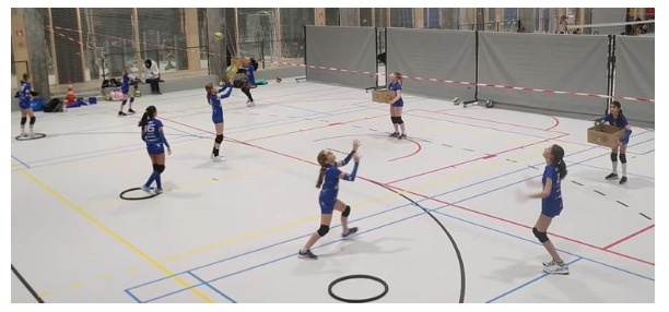 Le joueur qui était placé dans le pneu lance pour lui-même et joue en passe haute au-dessus de l’élastique.