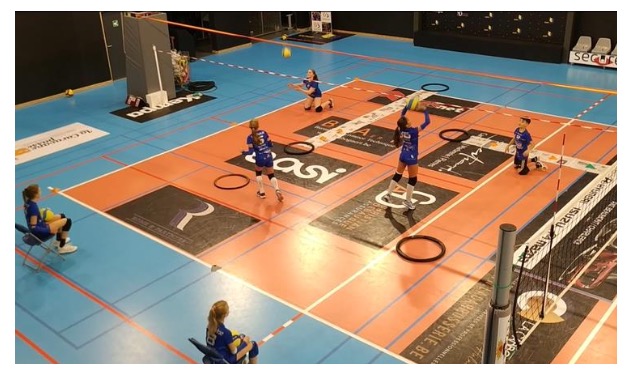 Le joueur assis sur la chaise lance la balle pour lui-même et la donne en passe haute sur le relayeur situé dans le pneu de vélo (cerceau).