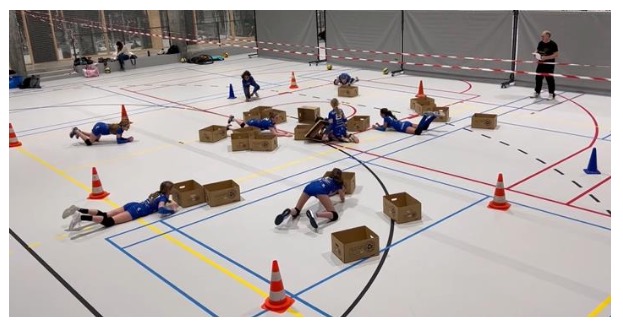 L’exercice propose le verbe « éjecter ». La caisse doit être éjectée de sa place au moyen des mains ou des pieds au départ d’une situation à genoux. Il n’est pas question d’accepter qu’on frappe dans la caisse comme dans un tir au football, sinon les caisses vont directement s’abîmer ou se refermer.