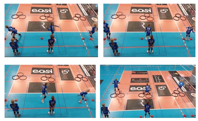 1. Au niveau des plots rouges, le joueur se met en écart autour d’un plot rouge. Il effectue un quart de tour pour se retrouver face à l’élastique pieds joints, et il effectue à nouveau un 2e quart de tour pour se retrouver en écart de pieds autour du 2e plot rouge.