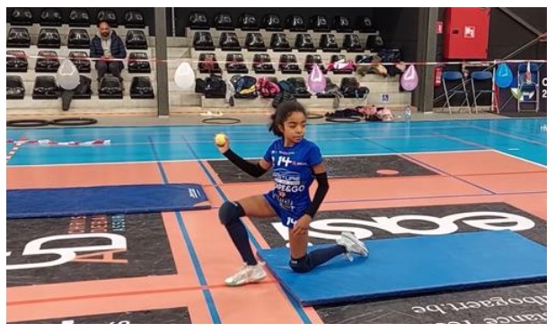 L’exercice est pareil, simplement, la position de départ des joueurs change. Ici, on démarre d’une position cavalier avec le pied droit sur le sol et le genou gauche sur le tapis.